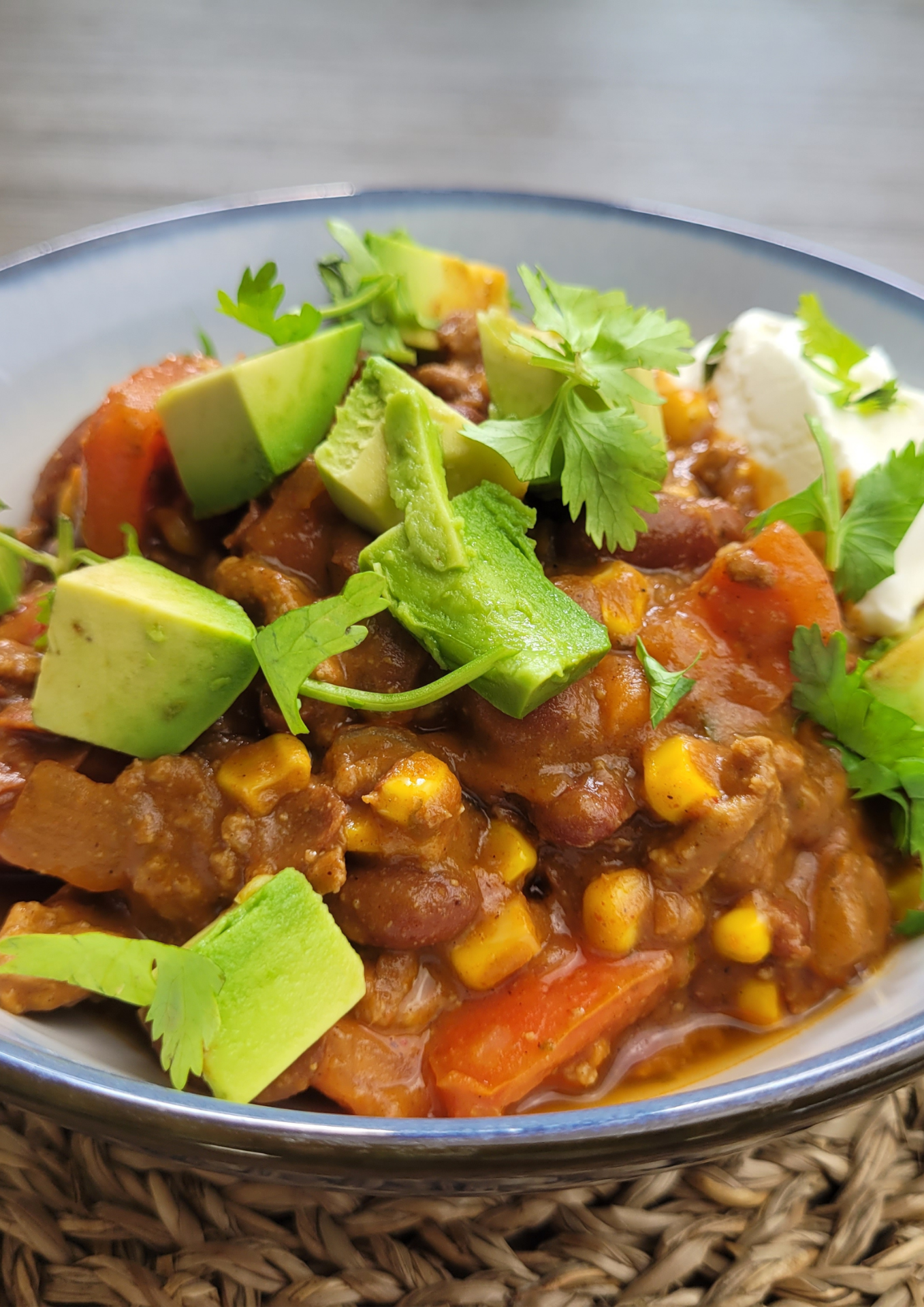 Ground Turkey, Red Bell Pepper. Tomatoes, Beans, Corn, Spices, Avocado