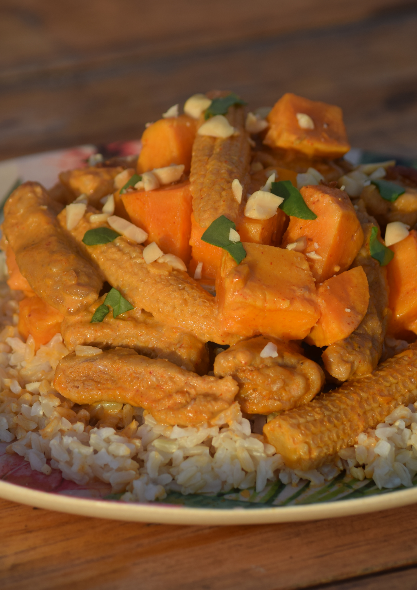 Brown Rice, Pork Loin, Baby Corn, Basil, Peanuts, Coconut Milk, Sweet Potato