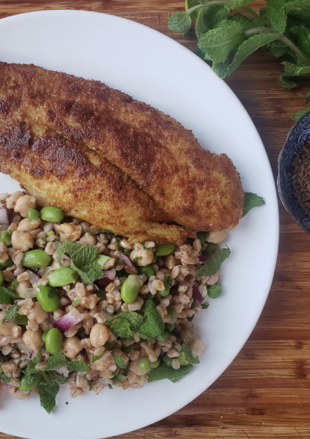 MINTY FARRO AND PEA SALAD WITH FISH FILLET
